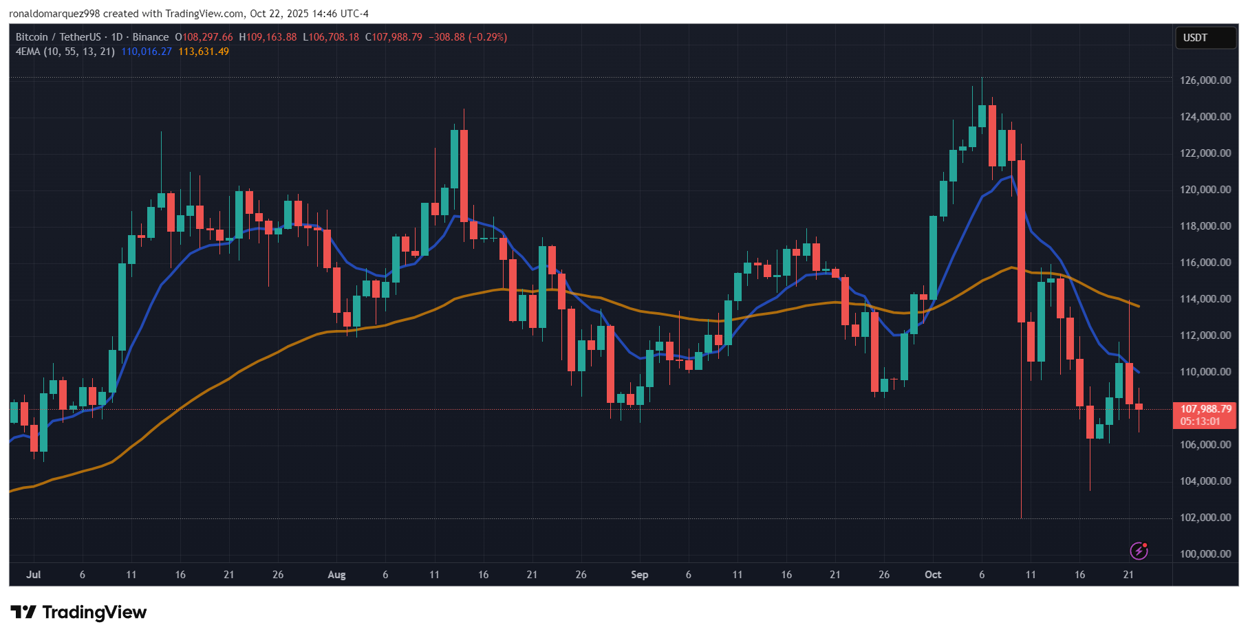 Kirjoitushetkellä Bitcoin on jatkanut laskutrendiään putoamalla konsolidointialueensa alimmalle tasolle 107 988 dollariin, mikä on 3,5 % laskua tiistain arvostuksesta.