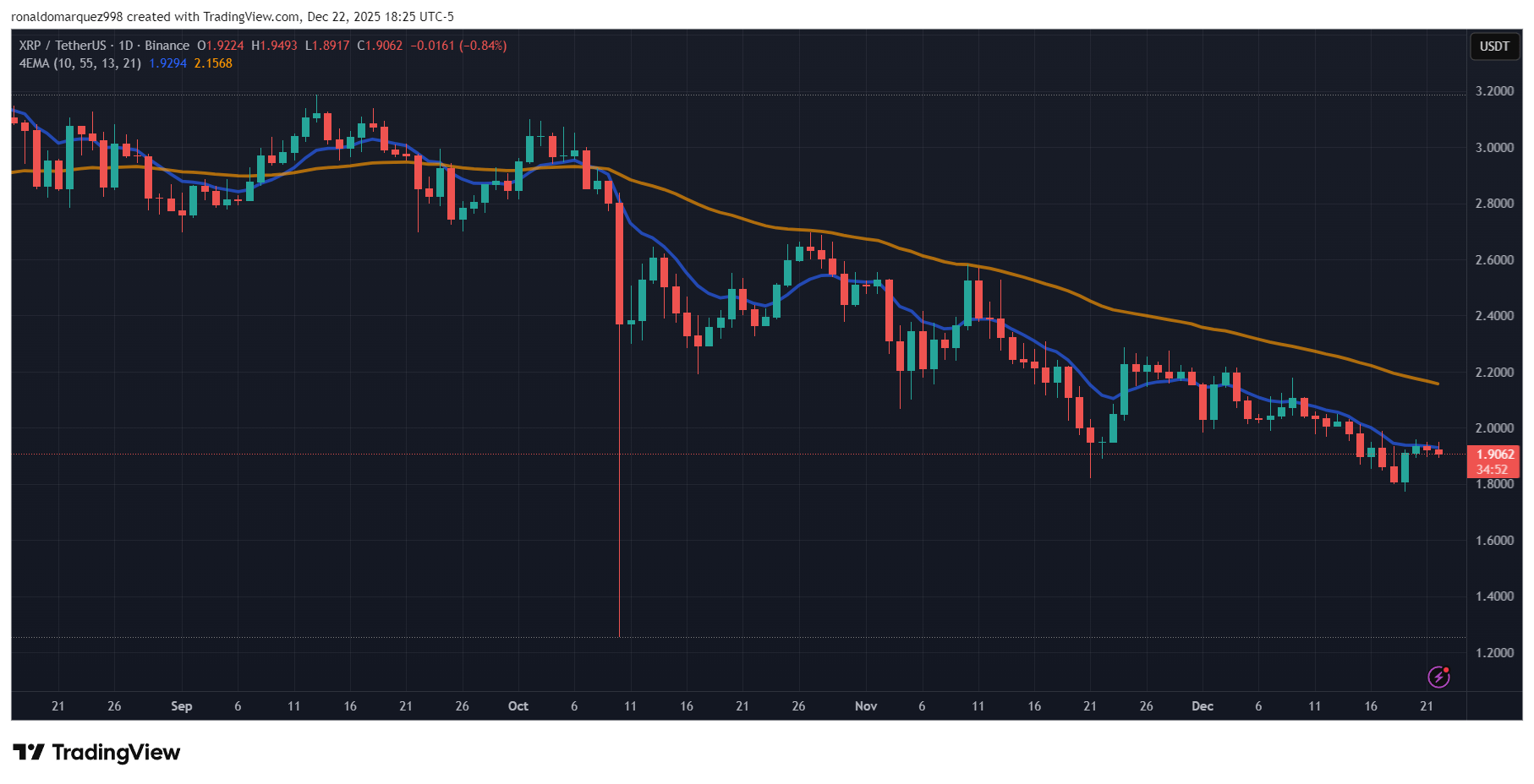 CoinGeckon tietojen mukaan XRP käy kauppaa alueella, jonka odotetaan kestävän ensi vuoteen 1,90 dollarissa, mikä on 2 % laskua 24 tunnin aikana.