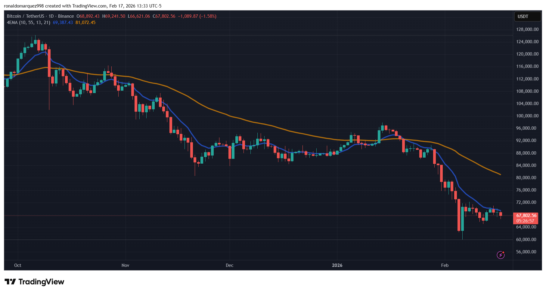 CoinGeckon tietojen mukaan BTC käy kauppaa noin 67 800 dollarilla tätä kirjoittamishetkellä, mikä on 2,6 % laskua edellisestä seitsemästä päivästä.