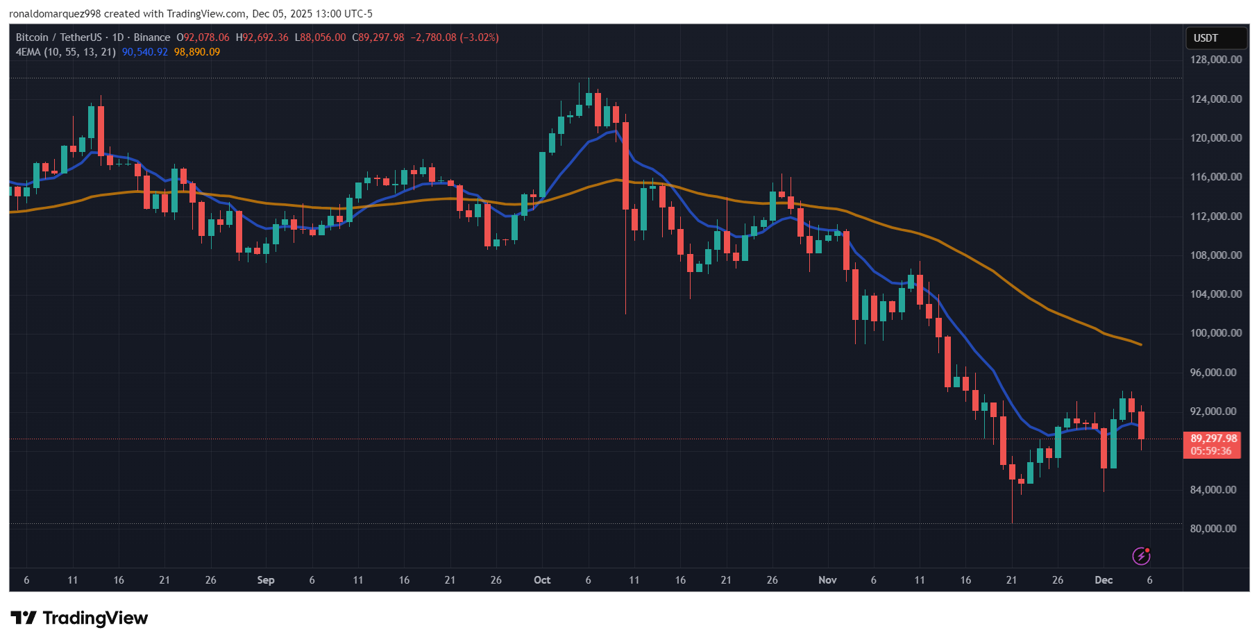 Päivittäinen kaavio näyttää BTC:n hinnan putoavan jälleen perjantaina alle 90 000 dollarin. Lähde: BTCUSDT osoitteessa TradingView.com