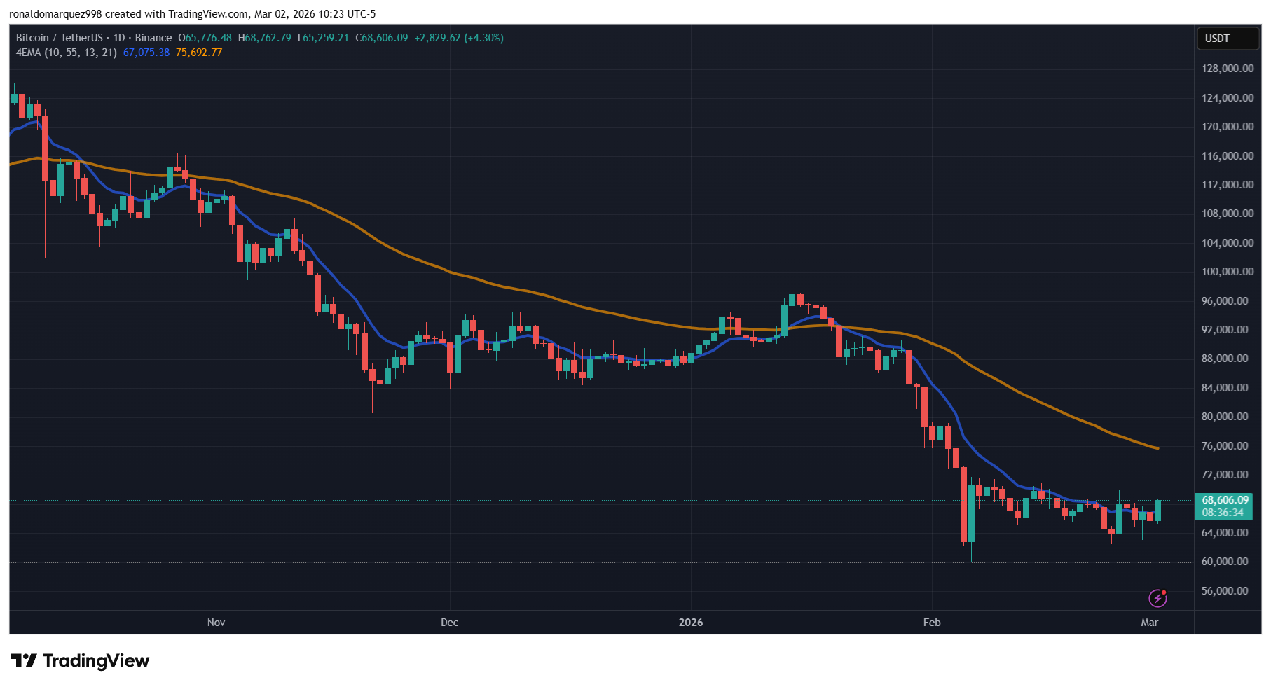 Kaaviossa 1D näkyy BTC toipumassa kohti 68 000 dollaria maanantaina. Lähde: BTCUSDT osoitteessa TradingView.com