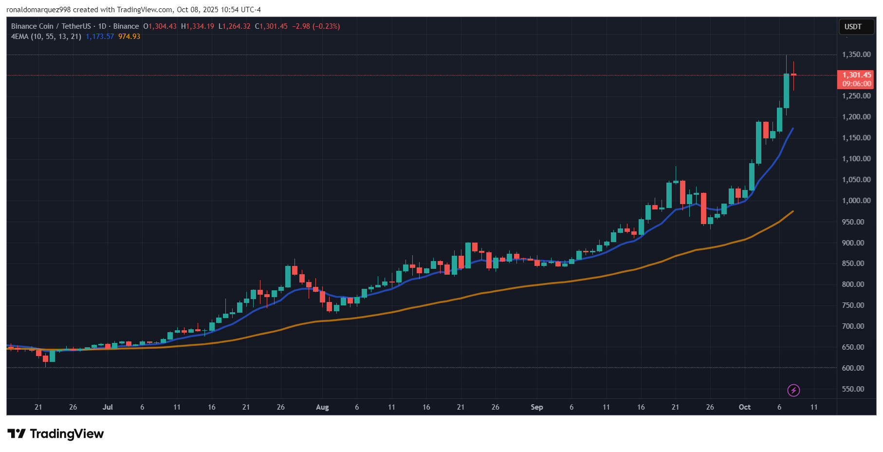 Äskettäinen vauhti on ollut erityisen huomattava, koska BNB -hinta näyttää saavuttavan 1 300 dollarin merkinnän uutena tukena uusille nouseville liikkeille, nouseen vain 2% korkeasta tiistaina ennätysrallinsa jälkeen.