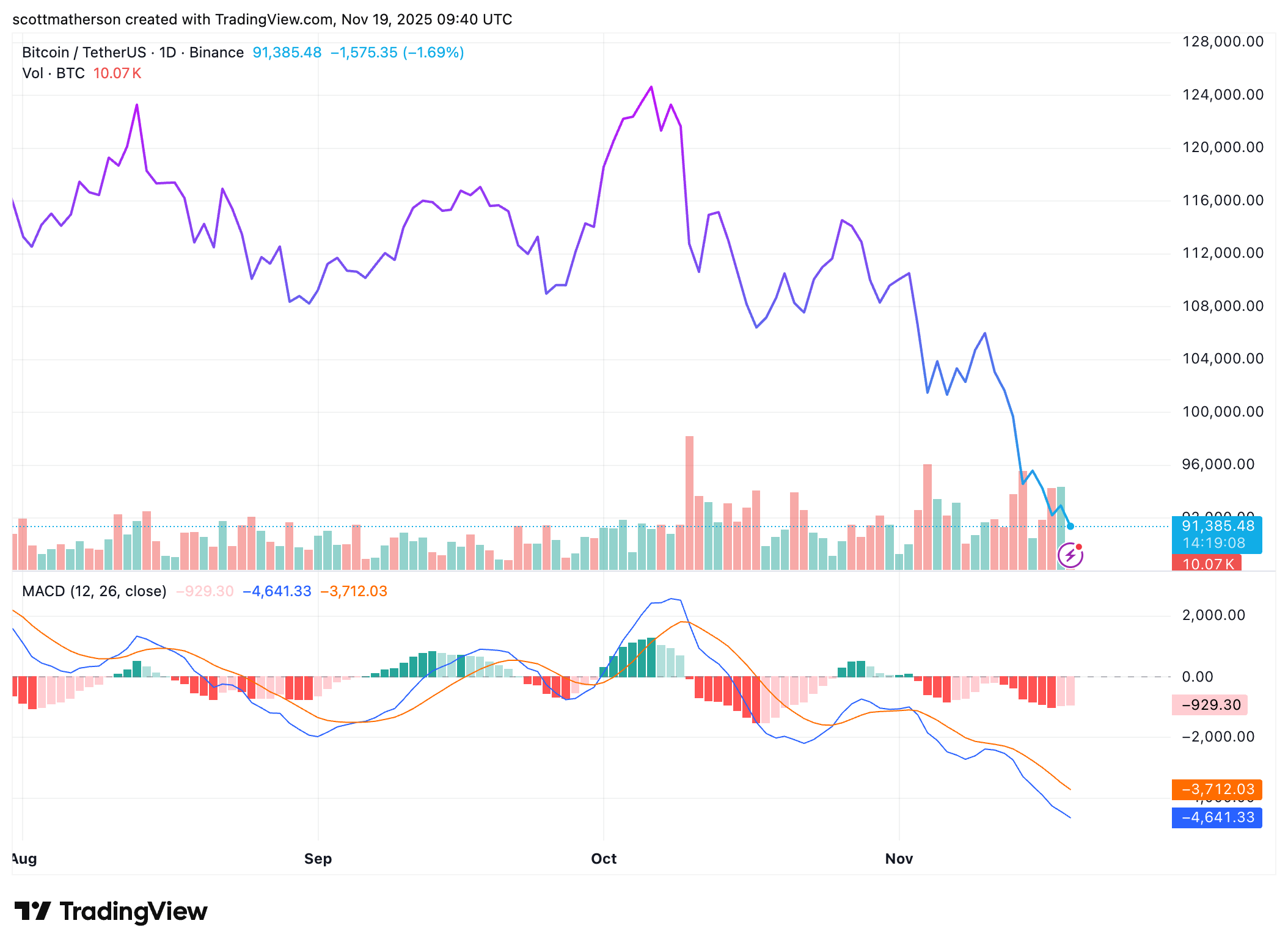 Tällä hetkellä Bitcoin käy edelleen kauppaa 90 000 dollarin hintatason yläpuolella. Viimeaikainen hintamuutos kuitenkin näki sen putoavan hetkeksi alle kynnyksen marraskuun 18. päivänä ja saavutti alimmillaan lähellä 89 000 dollaria ennen palautumista. Tämä liike osoittaa, että laskeva trendi etsii jo alhaisempaa tukea 80 000 dollarin alueella. Kirjoitushetkellä Bitcoinin kauppahinta on 91 080 dollaria.