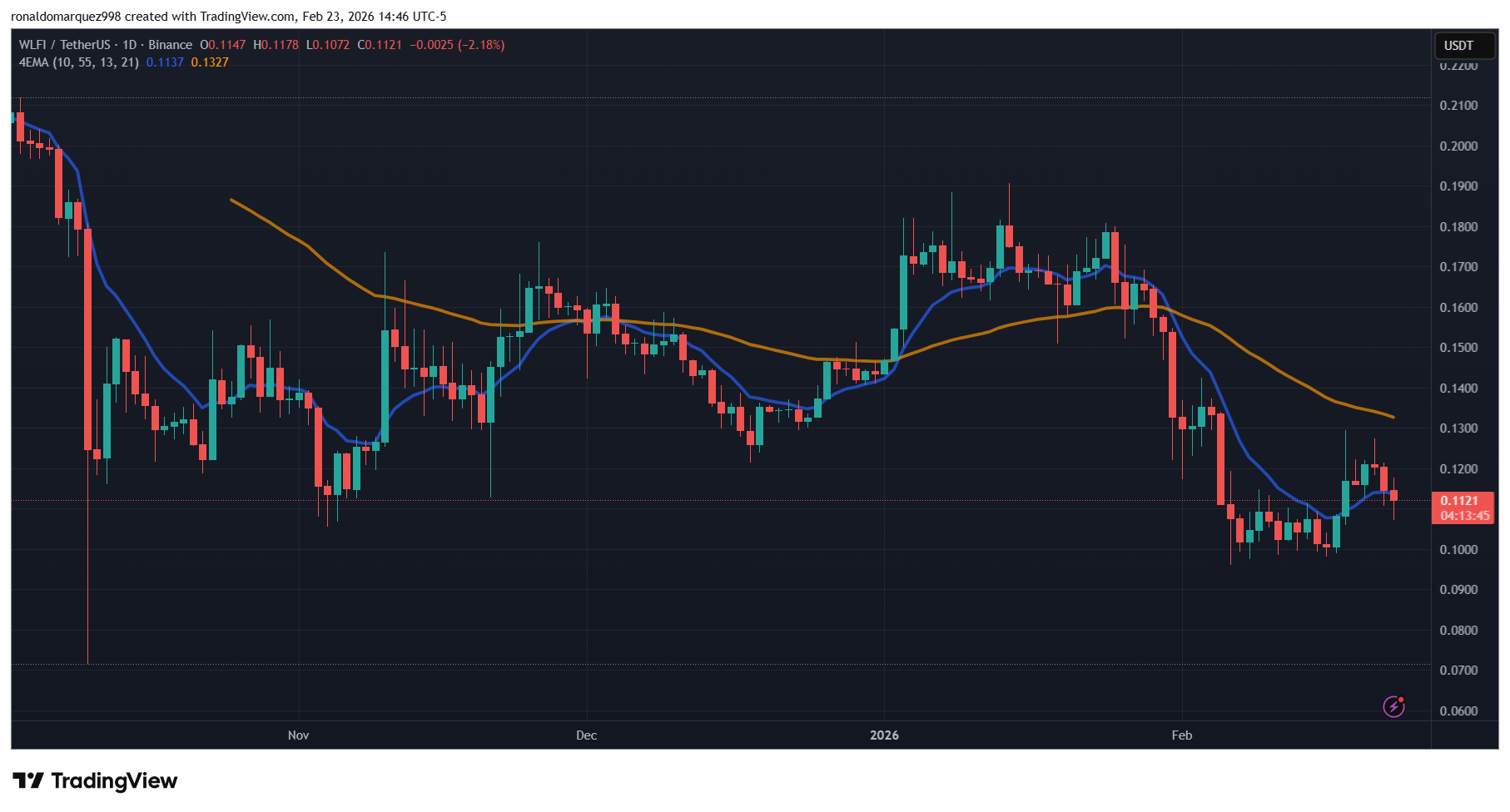 Kaaviossa 1D näkyy, että WLFI jatkaa laskuaan maanantaina. Lähde: WLFIUSDT osoitteessa TradingView.com